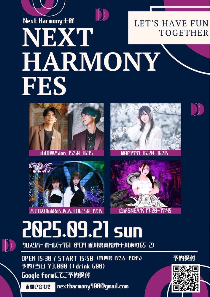 『NEXT HARMONY FES』(香川) SCHEDULE 2025/09/21(日) 15:30 - クロスリバーホール(香川県高松) \\🫧#バブロス LIVE情報🫧// 『NEXT HARMONY FES』 【日時】9/21(日) Open 15:30/Start 15:50 ※出番は16:50~ 【会場】クロスリバーホール(香川県高松) 【チケット】🎟 前売3,000円/当日3,000円 『NEXT HARMONY FES』(香川) URLをコピーする 報告する