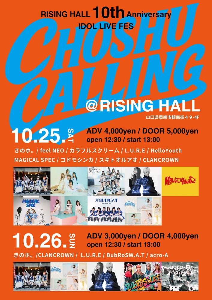 【日時】10/25.26 ※バブロスは26日参加 Open 12:30/Start 13:00 【会場】RISING HALL 【チケット】 25日:ADV 4,000円/DOOR 5,000円(入場時1Dオーダー) 26日:ADV 3,000円/DOOR 4,000円(入場時1Dオーダー) 発売中 25日:https://tiget.net/events/433002 26日:https://tiget.net/events/433510 【出演】きのホ。/feelNEO/カラフルスクリーム/L.U.R.E/HelloYouth/MAGICAL SPEC/コドモシンカ/スキトオルアオ/CLANCROWN/BubRoSW.A.T /acro-A