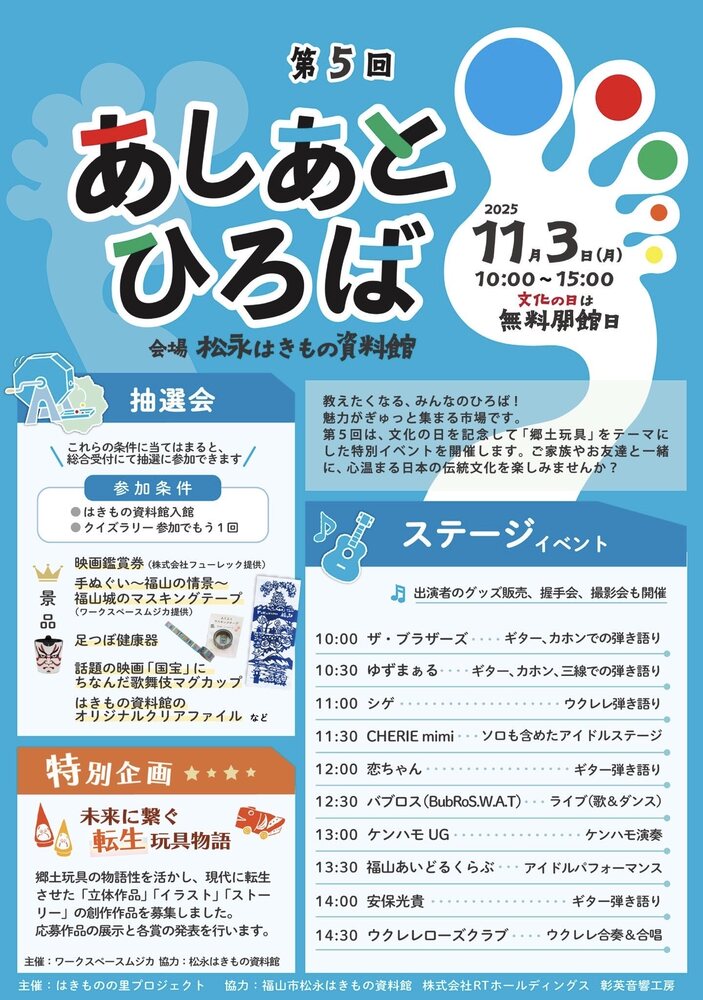 あしあとひろば SCHEDULE 2025/11/03(月) 12:00 - 【日時】11/2(日) OPEN10:00 / START10:00 バブロスは12:30出番 【会場】松永はきもの資料館 【チケット】無料 URLをコピーする 報告する