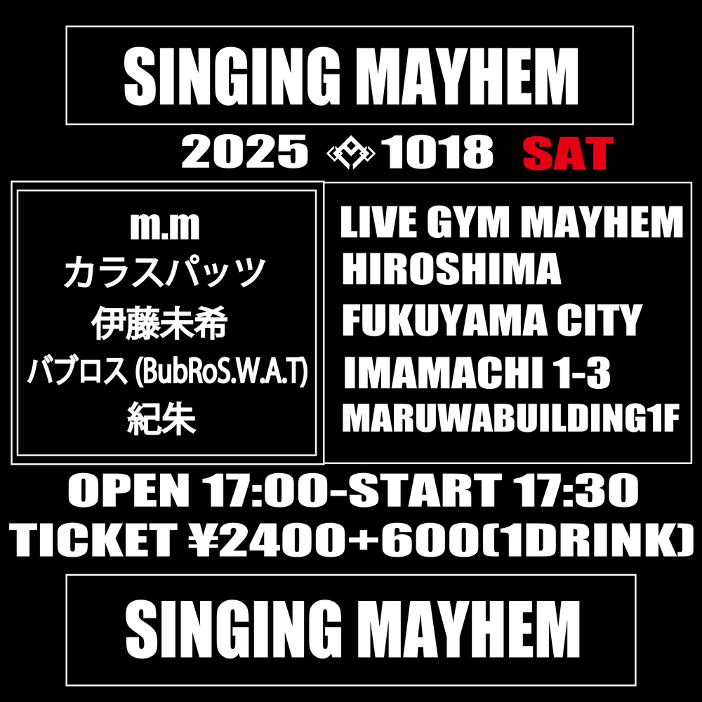 INGING MAYHEM SCHEDULE 2025/10/18(土) 17:00 - ■日程2025年10月18日(土)■会場LIVE GYM MAYHEM(福山)■時間OPEN17:00 ・START17:30 ■料金2,400円(1D600円) ■出演カラスパッツ/バブロス/伊藤未希/紀朱 ■備考本公演はスタンディング公演となります。再入場は可能です。 URLをコピーする 報告する